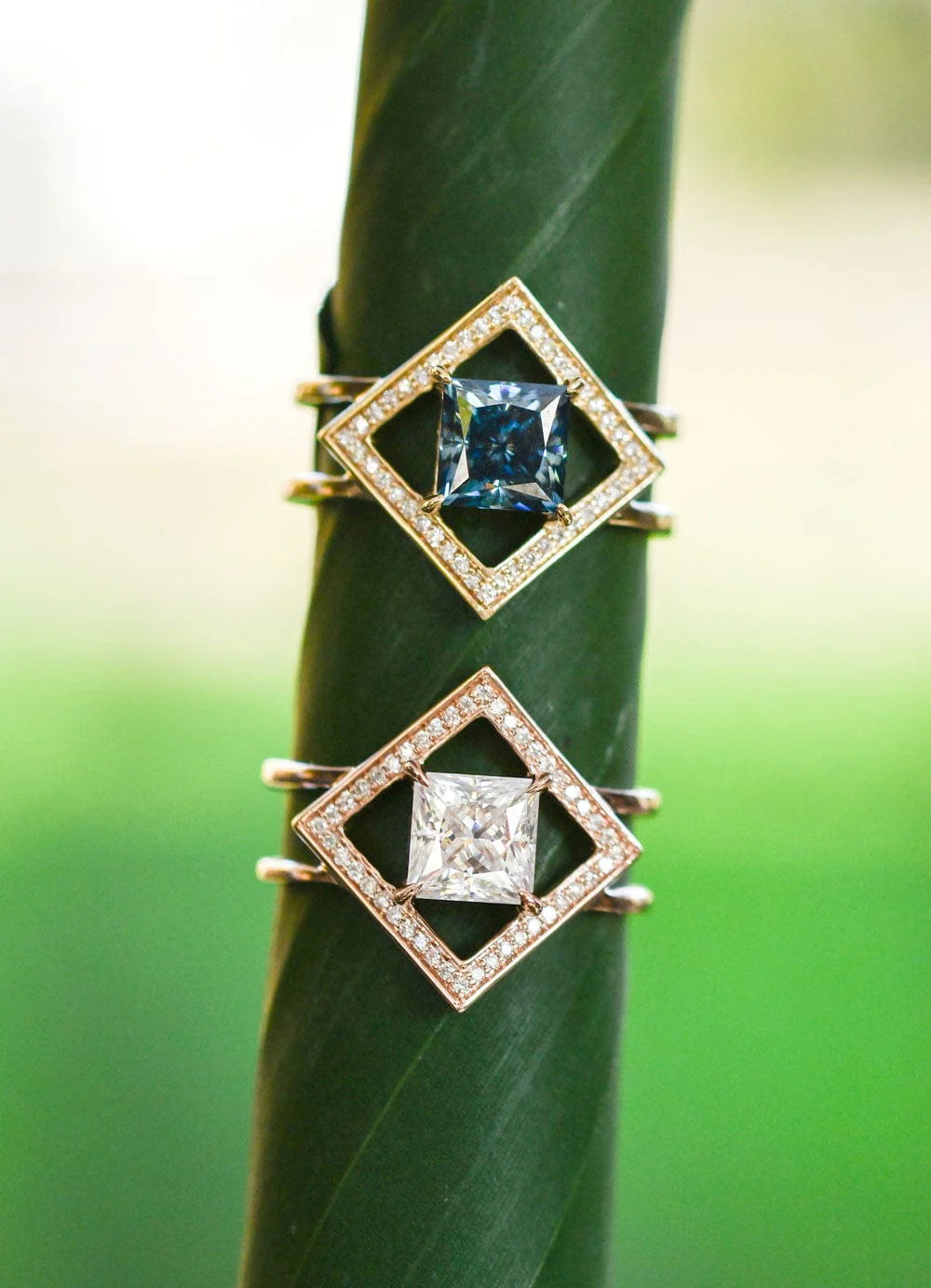 Design Breakdown: The brilliance of this piece lies in its "floating" composition. The 1.2ct princess-cut moissanite is held by delicate claw prongs, suspended within a diamond-lined square frame that captures light from every angle. The signature double-band shank provides a wide, modern foundation, ensuring the geometric focal point remains balanced and prominent. The contrast between the saturated blue center stone and the sparkling natural diamond accents (.15ct) creates a regal, high-contrast aesthetic that feels both fresh and sophisticated.